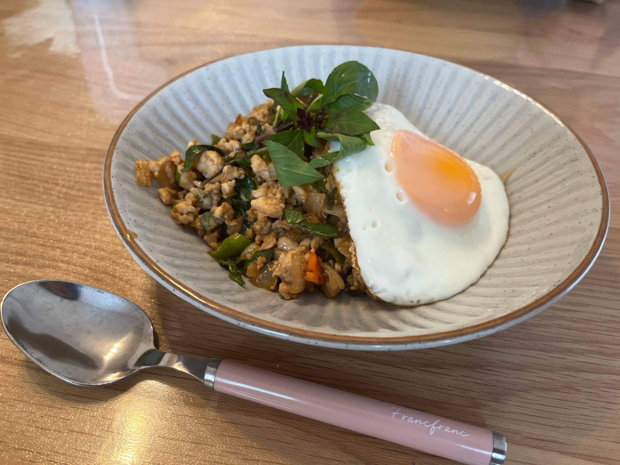 ホーリーバジルが香るガパオライス♪ナンプラーなしでも美味しくできます。鮮やかな色の野菜で見た目も楽しめます!野菜はその時にとれる旬の野菜でアレンジしてみてください!